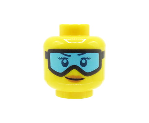Kopf einer LEGO Minifigur – Frau, Skibrille, Lächeln