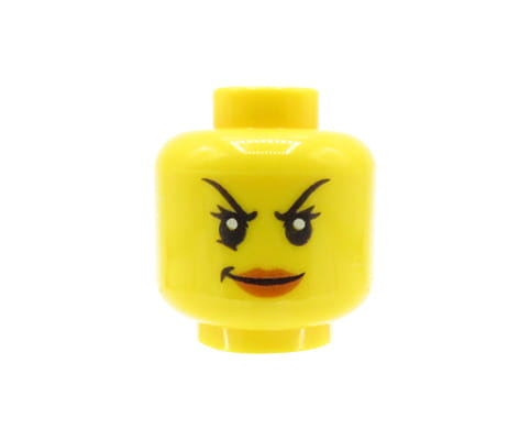 LEGO Minifigurenkopf – Frau, hochgezogene Augenbrauen, böses Lächeln. Kopf neu, stammt aus einem originalen LEGO Set.