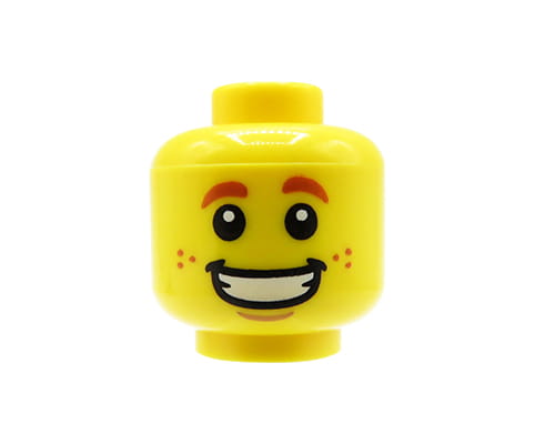 Kopf einer LEGO Minifigur – männlich, offenes Lächeln, Sommersprossen