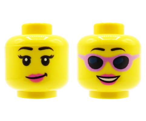 Kopf einer LEGO Minifigur – weiblich, Sonnenbrille, Lächeln, doppelseitig