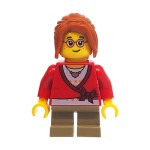 LEGO City Minifigur – Kleines Mädchen/Kind – roter Pullover mit Schleife und Herzkette, langes dunkeloranges Haar (Pferdeschwanz) mit seitlichem Pony, Sommersprossen und rote runde Brille. Neue Minifigur aus einem originalen LEGO Set. Die Minifigur ist in einem Druckverschlussbeutel verpackt (Bitte beachten Sie, dass das Produkt keine offizielle LEGO Verpackung enthält).