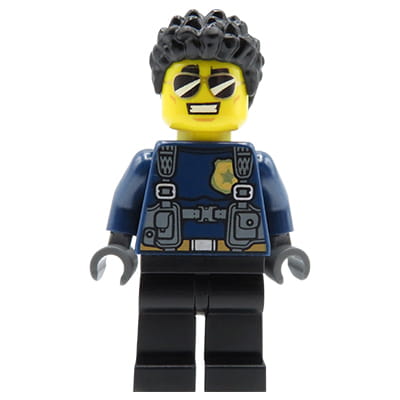 LEGO City Minifigur – Männlicher Polizist – dunkelblauer Polizeianzug mit Geschirr, schwarzes lockiges Haar, schwarze Hose. Neue Minifigur aus einem originalen LEGO-Set. Die Minifigur ist in einem Druckverschlussbeutel verpackt (Bitte beachten Sie, dass das Produkt keine offizielle LEGO-Verpackung enthält).