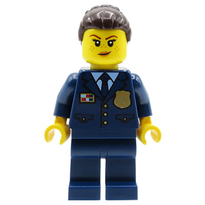 LEGO City Minifigur – Polizistin – dunkelbraunes Haar (hoher Dutt), Sommersprossen, dunkelblauer Polizeianzug mit goldenem Stern, Hemd und Krawatte. Neue Minifigur aus einem originalen LEGO Set. Die Minifigur ist in einem Druckverschlussbeutel verpackt (Bitte beachten Sie, dass das Produkt keine offizielle LEGO Verpackung enthält).