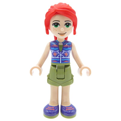 LEGO Friends Minipuppe – Mia – olivgrüne Shorts, dunkelviolette ärmellose Jacke mit Reißverschluss, rote Haare (Pferdeschwanz). Brandneue Minifigur aus einem originalen LEGO-Set. Die Minifigur ist in einem Druckverschlussbeutel verpackt (Bitte beachten Sie, dass das Produkt keine offizielle LEGO-Verpackung enthält).