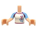 LEGO Friends Minifiguren-Torso – weißes Sport-T-Shirt mit blauen Ärmeln, hellen Nougat-Armen. Torso neu, stammt aus einem originalen LEGO-Set.