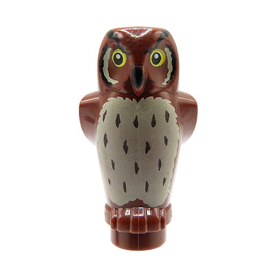 LEGO Harry Potter Eule – rotbraun mit schwarzem Schnabel, gelben Augen und hellbrauner Brust. Neuer Vogel, stammt aus einem originalen LEGO Harry Potter Set.
