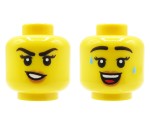 LEGO® Minifigurenkopf in klassischem Gelb mit doppelseitigem Gesichtsdruck. Eine Seite zeigt ein breites Lächeln mit Schweißtropfen, die andere einen verschmitzten Gesichtsausdruck. Der Kopf ist brandneu und stammt aus einem offiziellen LEGO® Set.