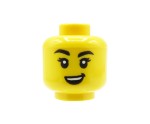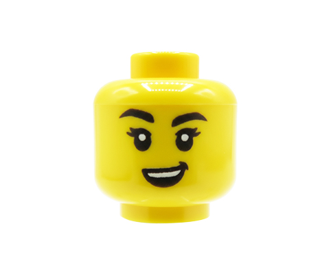 LEGO® Minifigurenkopf in klassischem Gelb mit einem selbstbewussten Frauengesicht und einem frechen, seitlich geneigten Lächeln. Das aufgedruckte Gesichtsdesign verleiht der Figur einen kühnen und verspielten Ausdruck. Dieser Kopf ist brandneu und stammt aus einem offiziellen LEGO® Set.