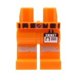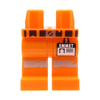 LEGO Minifigurenbeine – orangefarbene Hose mit schwarzem Gürtel und der ID „Emmet“. Neue Beine, stammen aus einem originalen LEGO-Set.