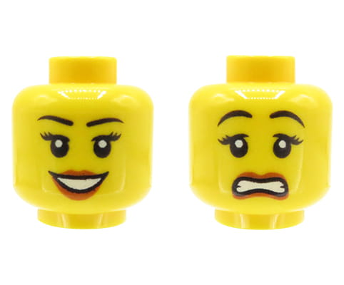 LEGO Minifigurenkopf – Frau, doppelseitig (offenes Lächeln / ängstlich). Kopf neu, stammt aus einem originalen LEGO Set.