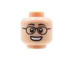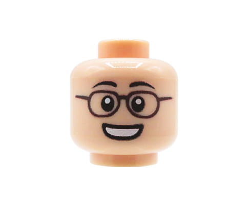 Custom Minifigurenkopf – light nougat Gesicht, männlich mit Brille und einem breiten Lächeln.