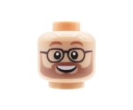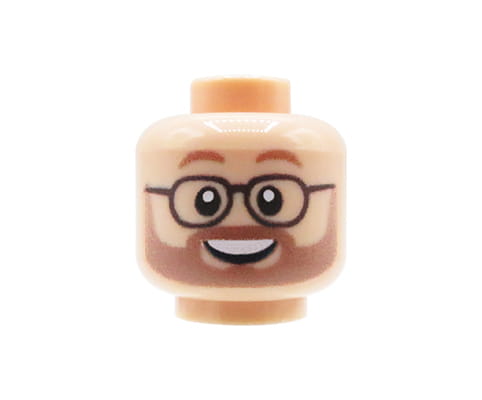 Custom Minifigurenkopf – light nougat Gesicht, männlich mit hellem Bart, Schnurrbart, Brille und einem breiten Lächeln.