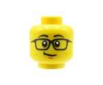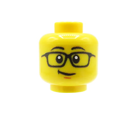 Custom Minifigur Kopf – gelb, männliches Gesicht mit schwarzer Brille, schiefem Lächeln und hochgezogenen Augenbrauen.