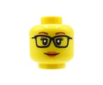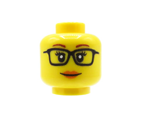 Custom Minifigurenkopf – gelbes Gesicht, weiblich mit schwarzer Brille und einem neutralen Gesichtsausdruck.