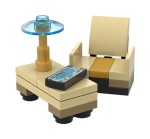 Wohnzimmermöbel – individuelles Set von Extra Extra Bricks, bestehend aus 100 % neuen, originalen Teilen der Marke LEGO. Eigenschaften des Modellbausatzes: Sessel und Tisch mit Lampe und Telefon, wie auf dem Bild zu sehen. Das Set ist in einem Druckverschlussbeutel verpackt. Die Möbel werden als lose Steine mit der dazugehörigen Bauanleitung geliefert. Ungefähre Abmessungen des zusammengesetzten Modells: 5,4 cm x 4 cm x 3,4 cm