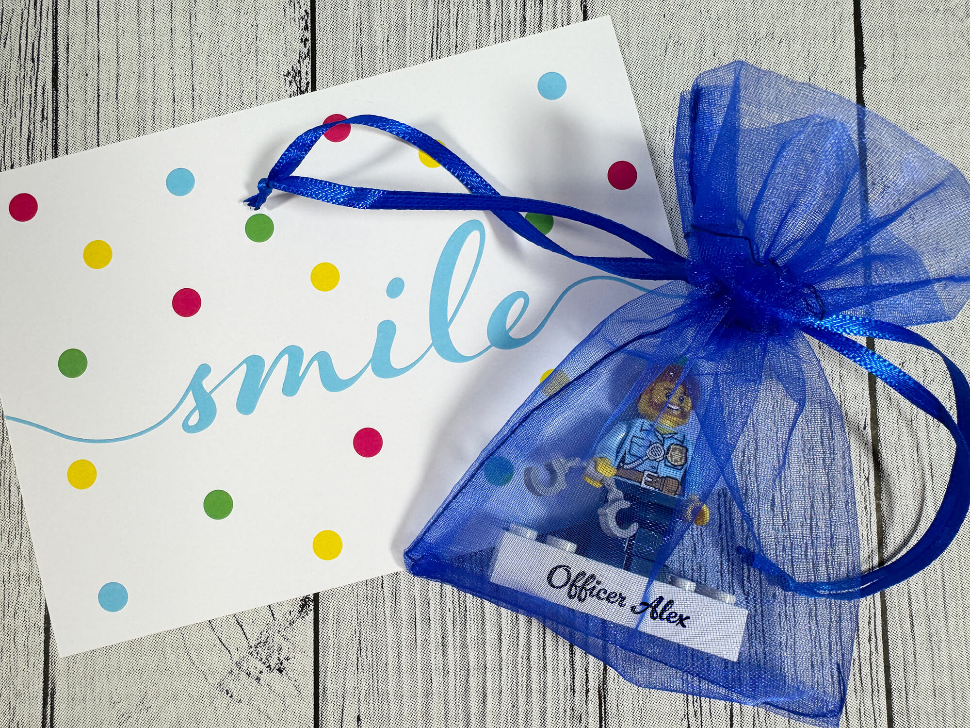 Die personalisierten Figuren bestehen aus neuen und originalen LEGO® Teilen sowie unseren exklusiv bedruckten Elementen – für Langlebigkeit, präzise Details und hochwertige Qualität. Jede Figur ist so groß wie eine LEGO® Minifigur (ca. 4 cm hoch). Deine „Polizist / Polizistin“-Figur steht auf einem weißen LEGO® Stein mit deinem Text, ergänzt mit Polizei-Zubehör. Verpackt in einem Organzabeutel mit Grußkarte – ein komplettes personalisiertes Geschenkset, sofort bereit zum Verschenken.