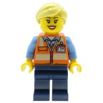 Minifigure LEGO City – Femme portant un gilet de sécurité – cheveux jaune clair (queue de cheval), jambes bleu foncé, gilet de sécurité orange avec bandes réfléchissantes et badge d'identification, sourire éclatant. Figurine neuve, issue d'un ensemble LEGO original. La figurine est emballée dans un sachet zip (veuillez noter que le produit n'est pas livré avec l'emballage officiel LEGO).