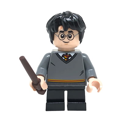 Minifigure LEGO Harry Potter - Harry Potter - jambes courtes noires, pull Gryffondor gris bleuté foncé, baguette magique. Minifigure neuve, issue d'un ensemble LEGO original. La minifigure est emballée dans un sac à fermeture éclair (veuillez noter que le produit n'inclut pas l'emballage LEGO officiel).