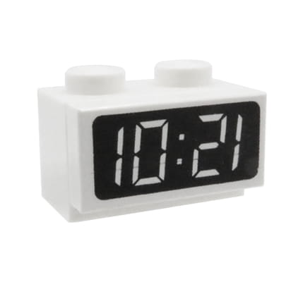 Horloge électronique / réveil numérique - blanc. Produit composé à 100 % de pièces LEGO neuves et originales. Dimensions approximatives : 1,5 cm x 1 cm x 1,2 cm.