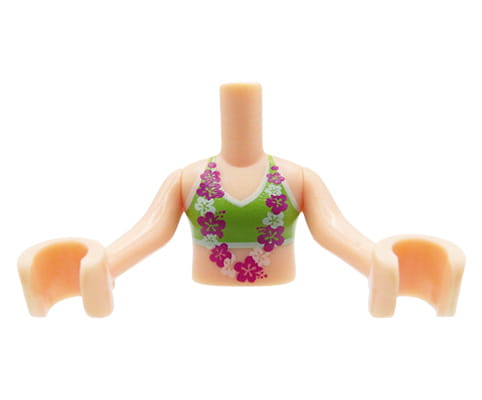 Torse de figurine LEGO Friends : haut de bikini vert citron, collier de fleurs, bras couleur nougat clair. Torse neuf, issu d'un ensemble LEGO original.