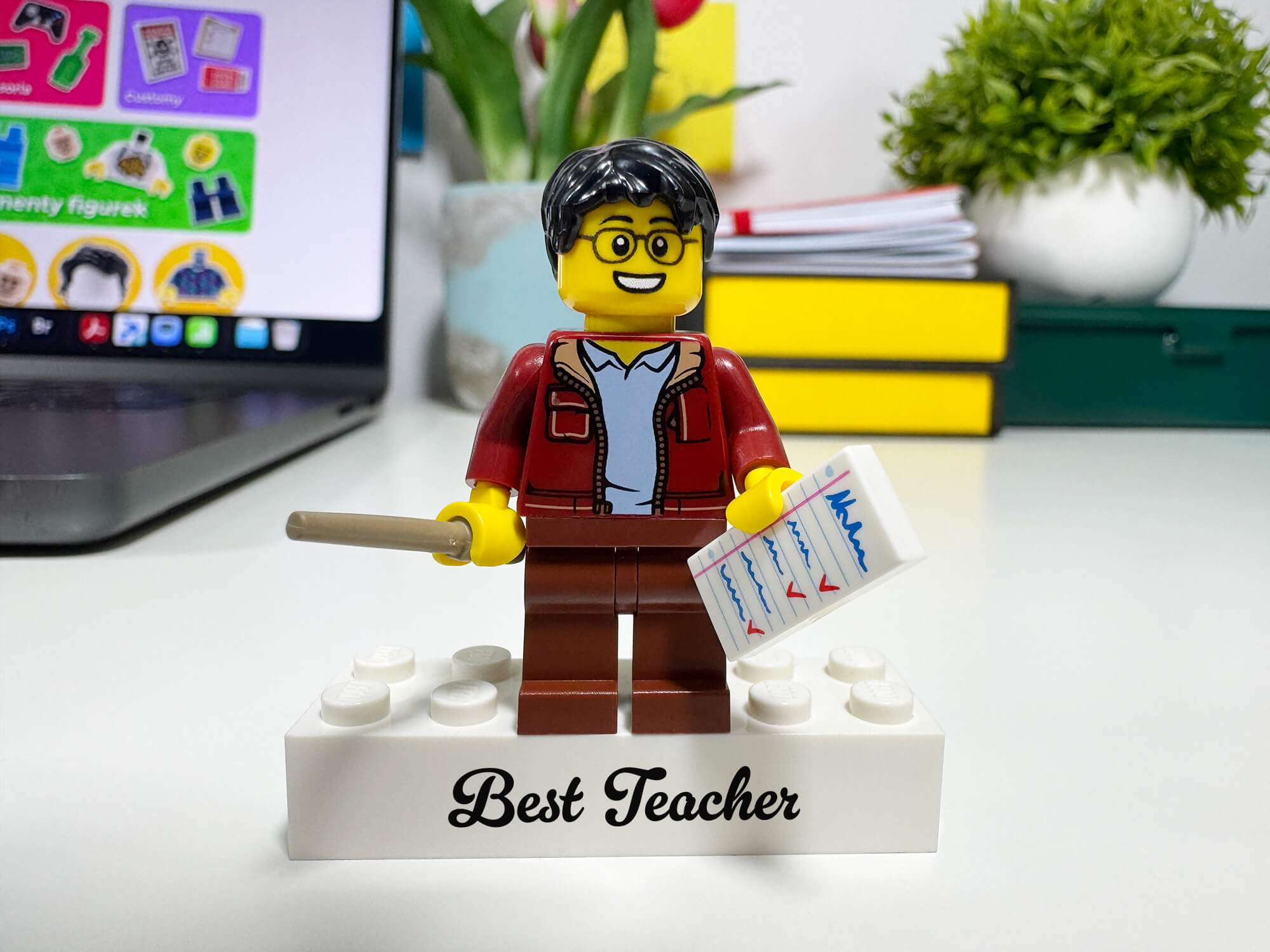 Cette figurine personnalisée à partir de pièces LEGO® est un cadeau unique et symbolique pour un professeur, une professeure ou un tuteur. Une figurine personnalisée avec ton propre texte est un présent attentionné pour la fête des professeurs, la fin de l’année scolaire ou comme cadeau de remerciement de la part de toute la classe.