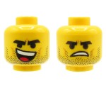 Tête de minifigure LEGO : homme, barbe de trois jours, sourcils noirs, double face (sourire ouvert / colère). Tête neuve, issue d'un ensemble LEGO original.