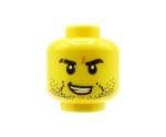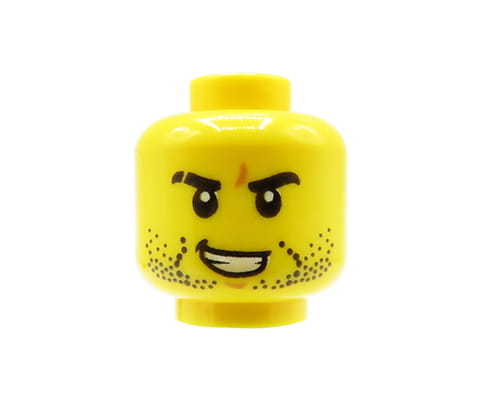Tête de minifigure LEGO : homme, barbe de trois jours, sourire franc, cicatrice sur le sourcil droit. Tête neuve, issue d'un ensemble LEGO original.