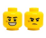 Tête de minifigure LEGO : homme, cicatrice sur la joue, double face (grand sourire avec dents / grincheux). Tête neuve, issue d'un ensemble LEGO original.