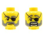 Tête de minifigure LEGO : homme/pirate, cache-œil noir, barbe grise, double face (bouche fermée/effrayée, bouche ouverte). Tête neuve, issue d'un ensemble LEGO original.