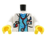 Tors minifigurki LEGO lekarz - biały fartuch lekarski z niebieską koszulką i stetoskopem na szyi. Tors nowy, oryginalny, pochodzący z jednego z zestawów LEGO.