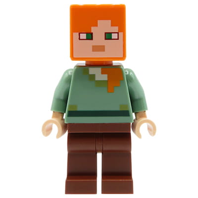 Minifigurka LEGO Alex w brązowych spodniach i piaskowo-zielonej bluzce. Ludzik nowy, oryginalny, pochodzący z jednego z zestawów LEGO Minecraft