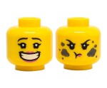Głowa figurki LEGO w kolorze żółtym, dwustronna, damska, różowe usta, szeroki uśmiech z widocznymi zębami / plamy brudu, wściekła mina. Główka nowa, oryginalna, pochodząca z jednego z zestawów LEGO.