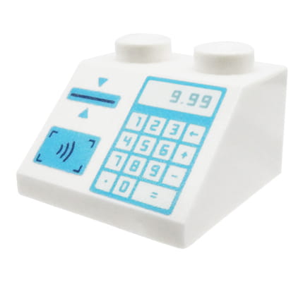 LEGO kasa sklepowa - skos w rozmiarze 2x2 w kolorze białym z nadrukiem. Kasa nowa, oryginalna, pochodząca z jednego z zestawów LEGO.